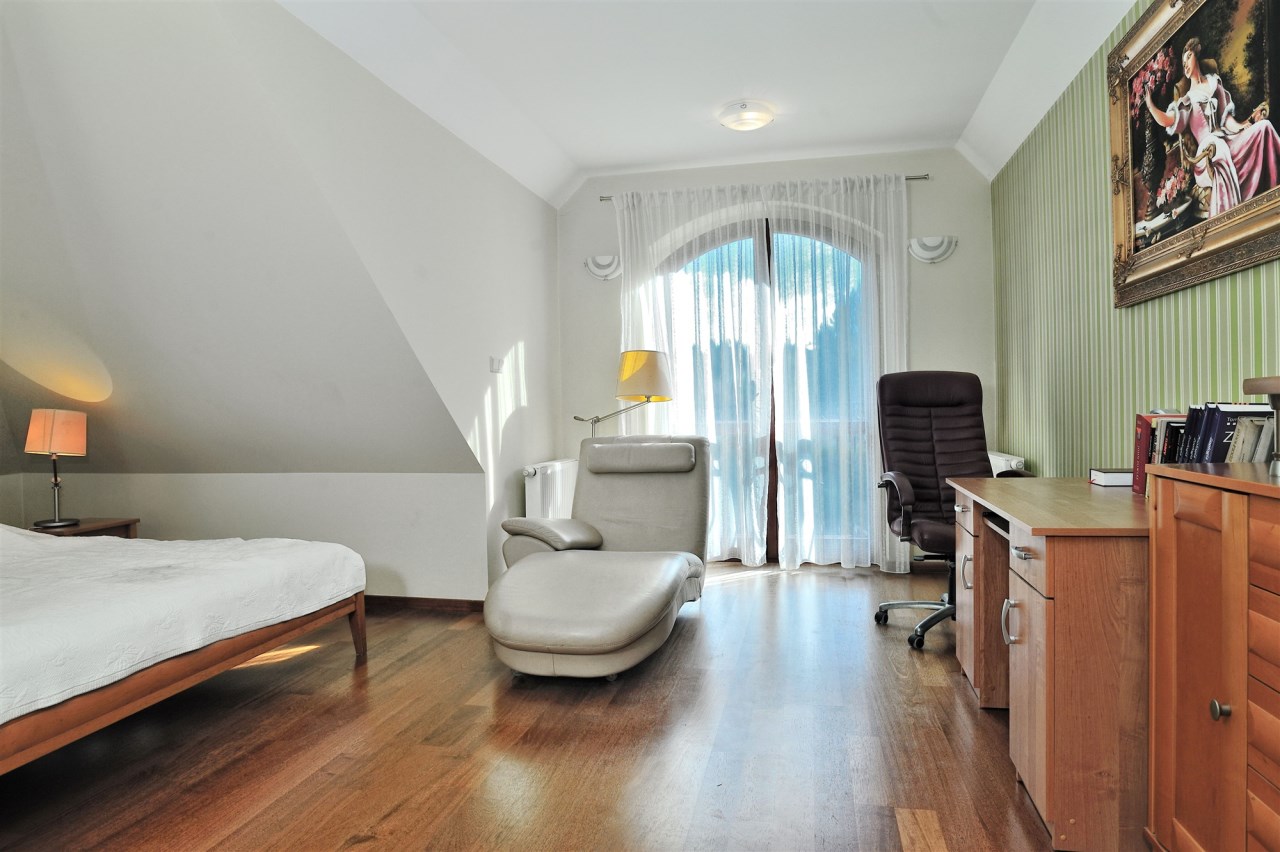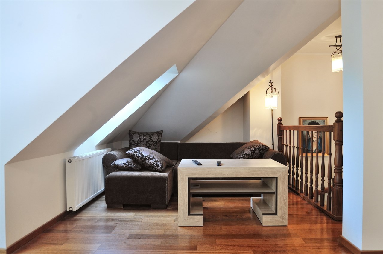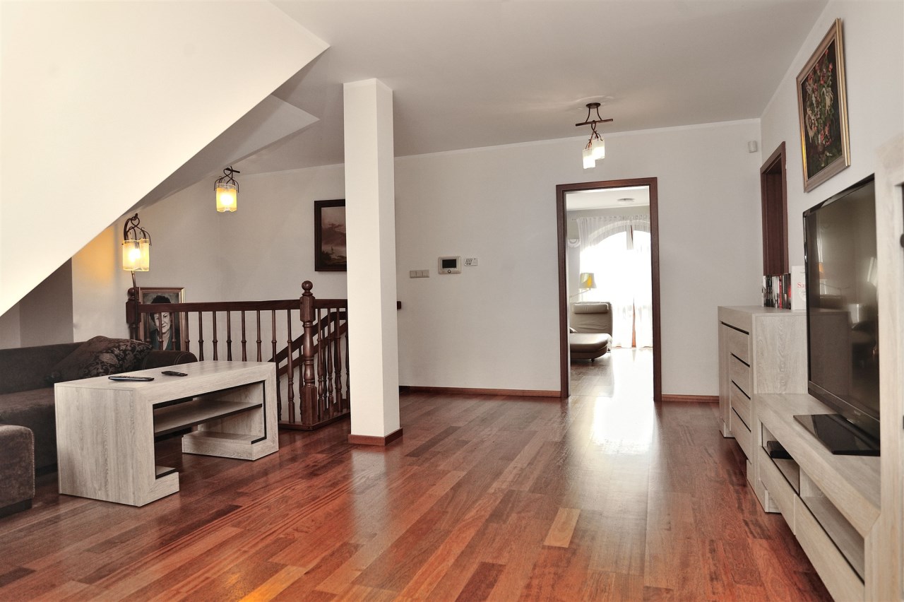 Na piętrze : dwa pokoje w tym jeden z osobną garderobą , salon łazienkowy.