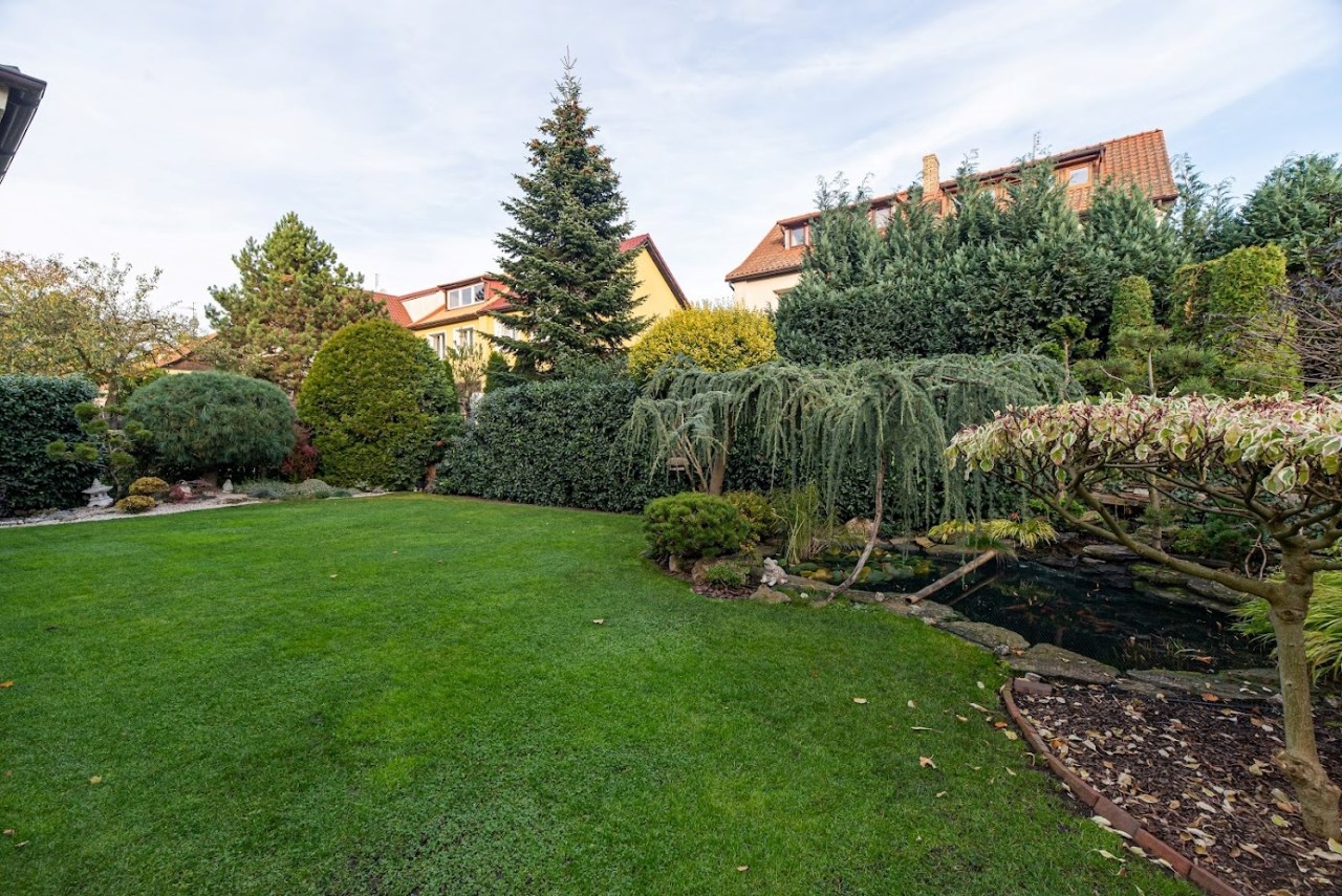 Nieruchomość usytuowana jest frontem do parku, na przepięknie zagospodarowanej działce o powierzchni 716 m² z oczkiem wodnym zarybionym, licznymi nasadzeniami i idealnie utrzymanym trawnikiem wyposażonym w automatyczny system nawadniania i robota koszącego.