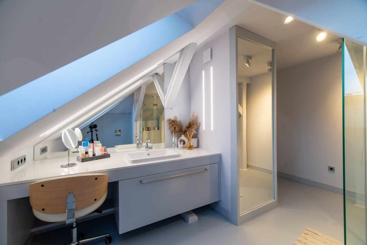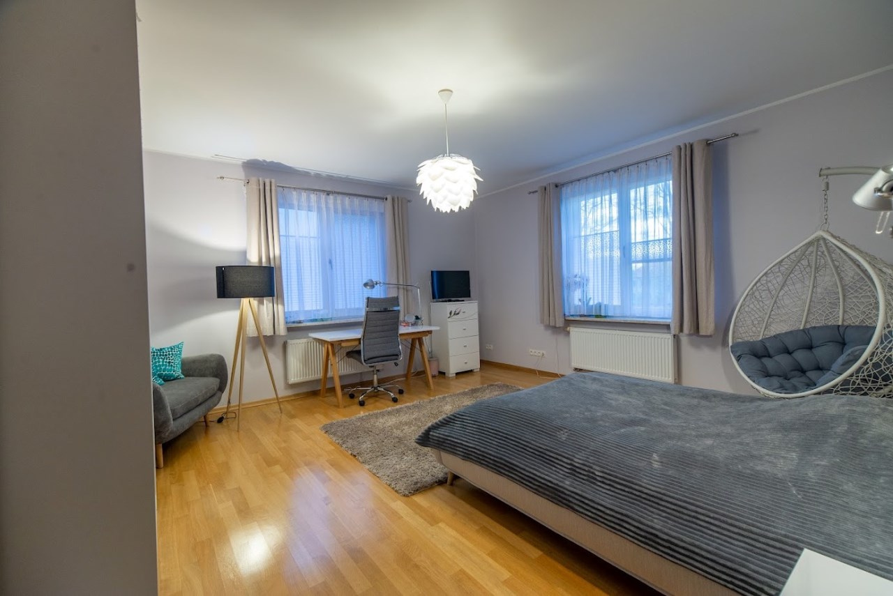 - Sypialnia typu master bedroom (z klimatyzacją) z prywatnym salonem kąpielowym, dużą garderobą i wyjściem na taras,