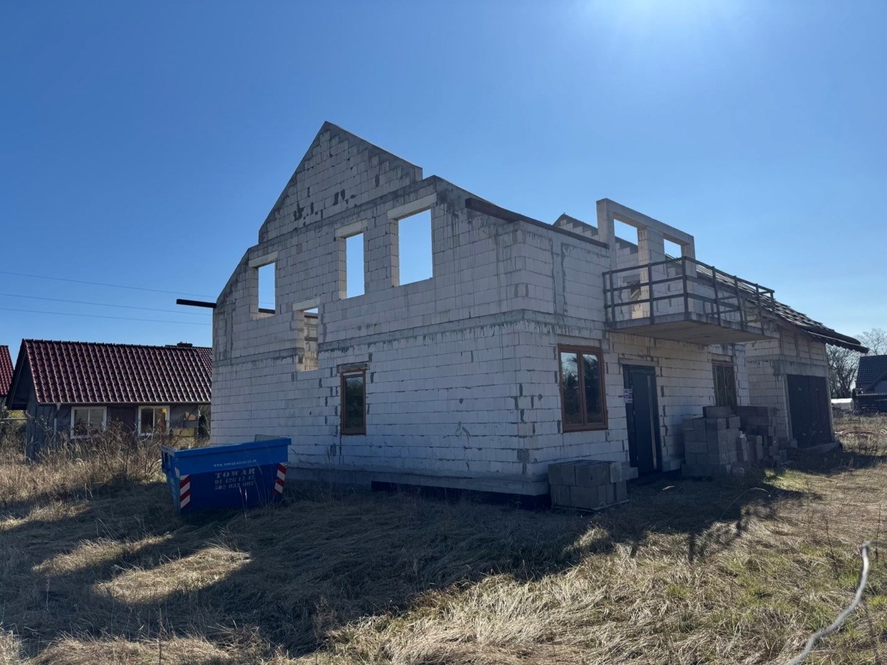 Lęgi ul. Modra - w otulinie lasu Dom wolnostojący z garażem dwustanowiskowym oraz domkiem letnim na terenie działki, w trakcie budowy - Stan surowy otwarty. Bardzo duża przestrzeń do adaptacji - ok. 240m powierzchni użytkowej. Nad garażem znajdują się dodatkowe pokoje. Parter: - Salon z aneksem kuchennym - 2 x pokój - Spiżarnia - Pomieszczenie techniczne - Łazienka I Piętro: - 3 x Sypialnia - Sypialnia z garderobą - Łazienka Uzbrojenie terenu: - energia elektryczna - Gazociąg - Studnia głębinowa - Zbiornik bezodpływowy