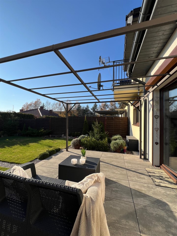 • od strony ogrodu – drewniana pergola i ogrodzenie z siatki.