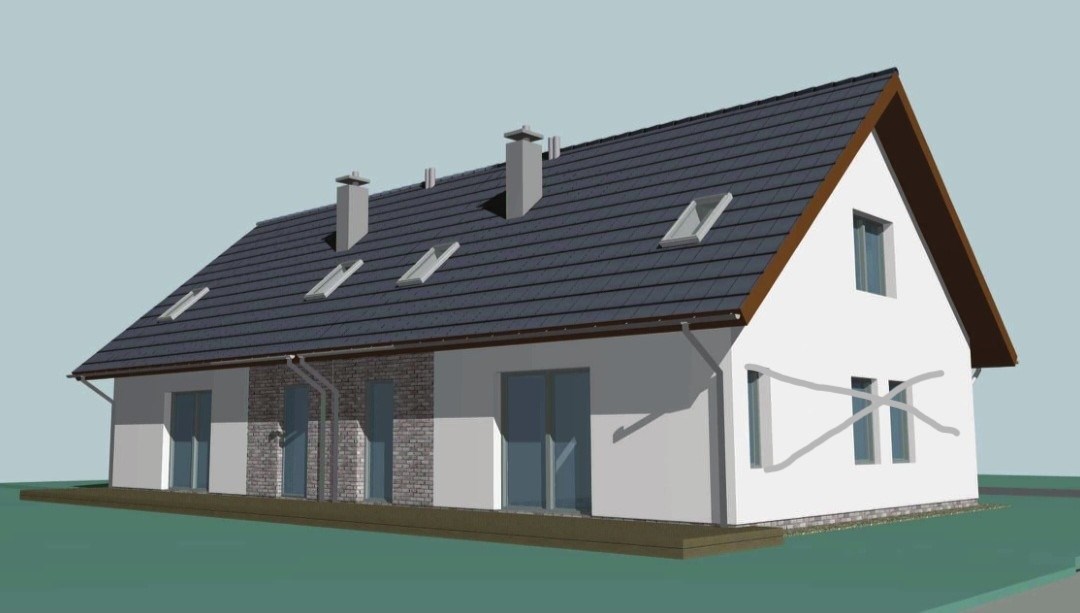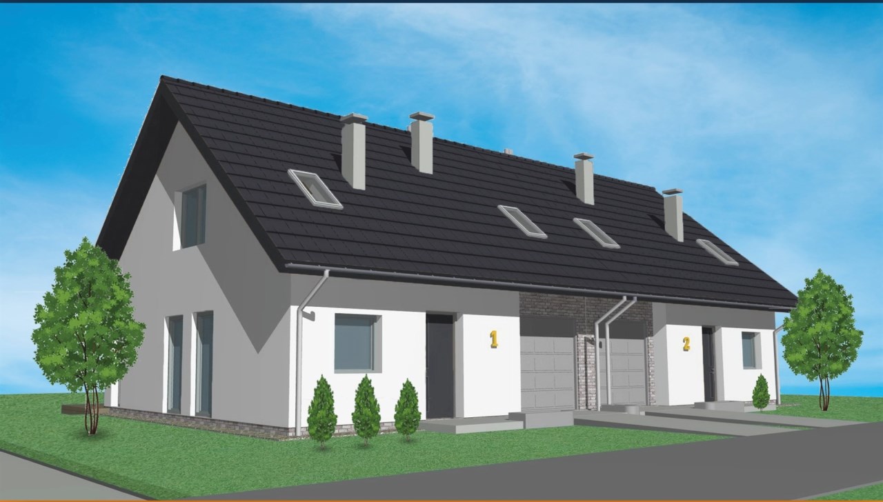 Dom jednorodzinny dwulokalowy w zabudowie bliźniaczej, na na działce 425 m2, o powierzchni użytkowej 130m2 powierzchni użytkowej. W projekcie podwójna ściana z dylatacją między sąsiadami co jest wymagane w zabudowie bliźniaczej a czego nikt z deweloperów nie stosuje w przypadku budynków dwulokalowych. Dostępne media: prąd, woda z wodociągu miejskiego, pompa ciepła, szambo. Budynki w stanie deweloperskim z elewacją i mediami doprowadzonymi do budynku. Budynki w tracie wykańczania, do wydania w I kwartale 2026 roku