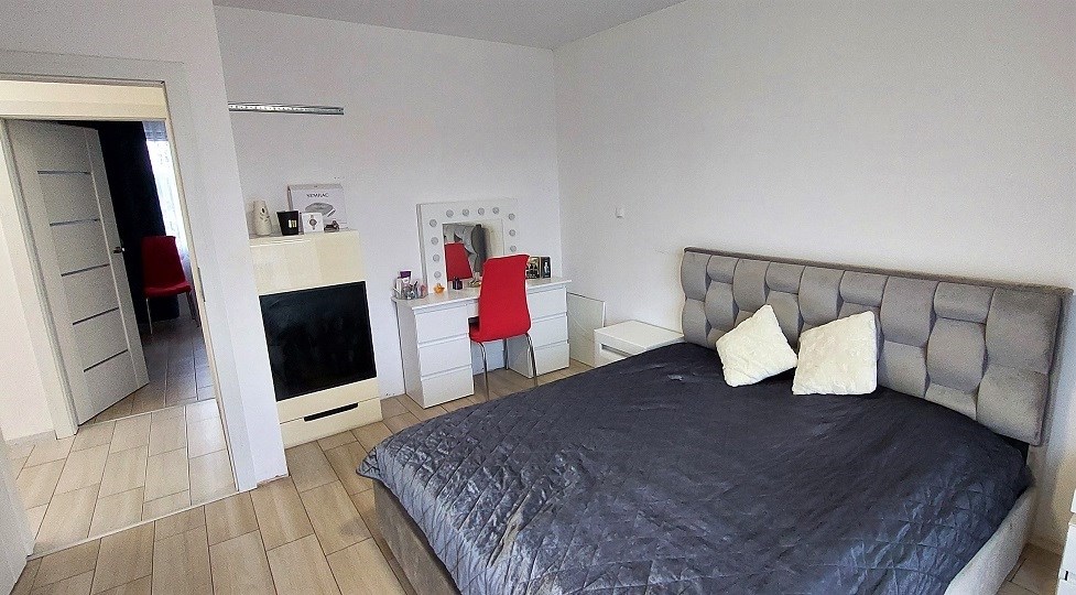 Ściany gładzone i malowane z rygipsu, w łazience i WC w glazurze. Podłogi z terakoty we wszystkich pomieszczeniach z ogrzewaniem podłogowym z wykorzystaniem powietrznej pompy ciepła. Dodatkowe ogrzewanie stanowi koza w salonie. Okna PCV 3 szybowe z wystawą na wschód, zachód i południe. Kuchnia wyposażona w zabudowę na wymiar i sprzęt AGD. W łazience wanna, sedes, umywalka. Ścieki odprowadzane do szamba z oczyszczalnią biologiczną. gazu brak.
