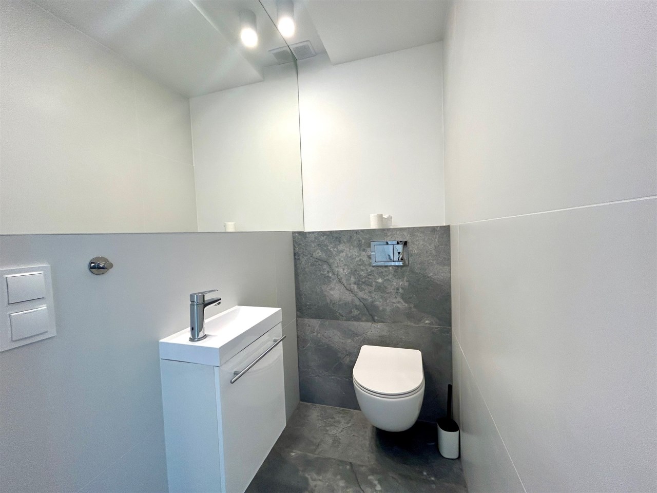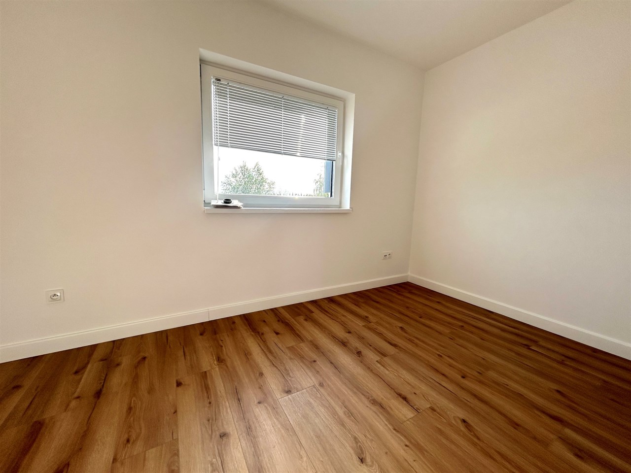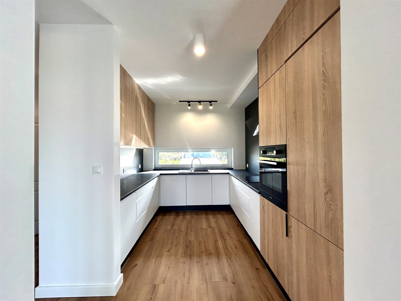Dom wykończony w jasnych, nowoczesnych barwach, z dużymi przeszkleniami i ogrzewaniem podłogowym w całym budynku.