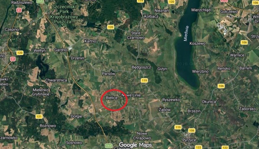 Kompleks działek budowlanych o powierzchniach 999/991/1128/1072/1049/1097/1202/1054/1135/1148/1140/1164/1167/1108/1114/1142/1095m2 w miejscowości gminnej Bielice pomiędzy miastami powiatowymi Szczecin, Gryfino, Pyrzyce, Stargard.