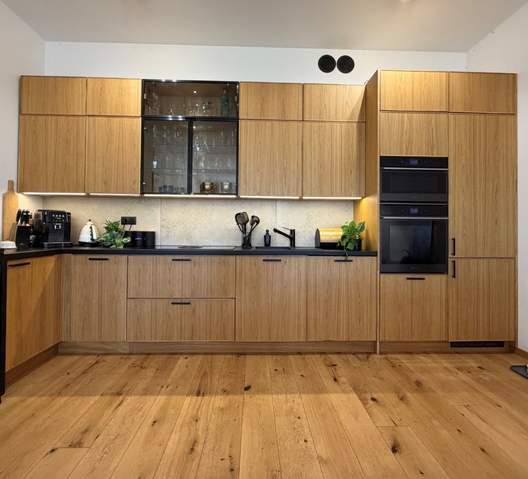 • zabudowa na wymiar – Rawa Meble, fronty z naturalnego forniru dębowego