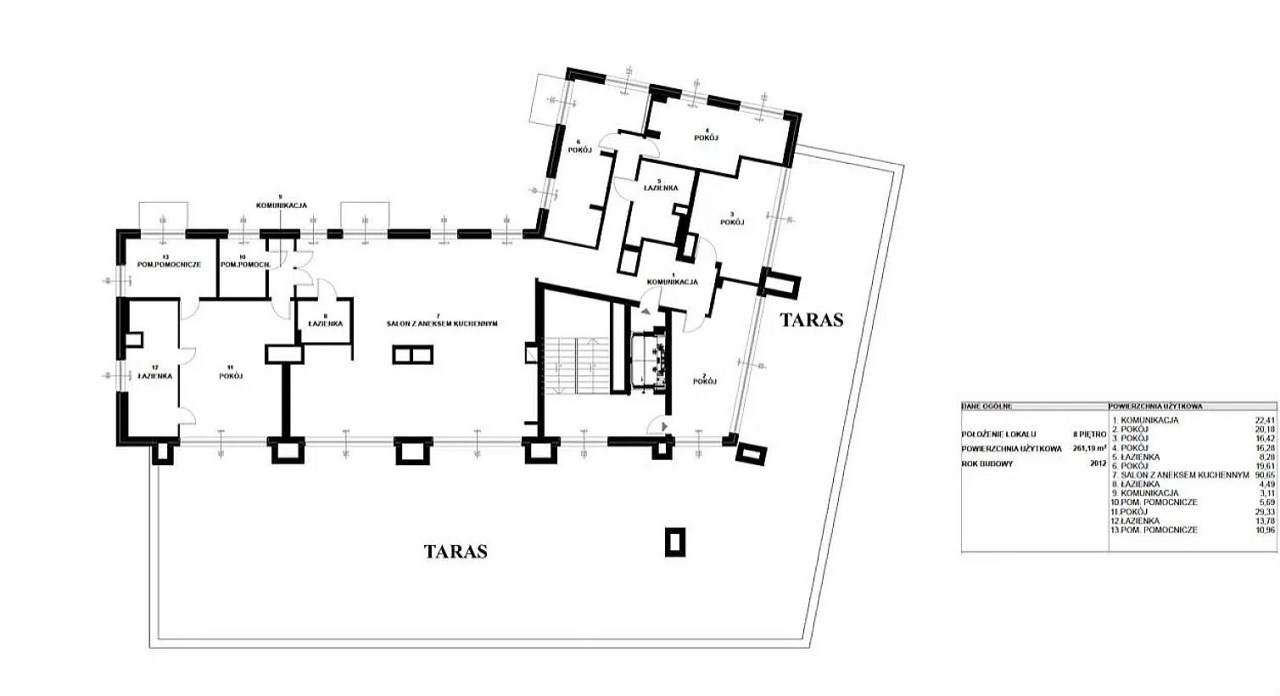 Powierzchnia mieszkalna 261 m2, dodatkowo taras 319 m2, 3 balkony o pow. 2,73 m2 każdy, 3 miejsca postojowe plus 2 pomieszczenia gospodarcze.