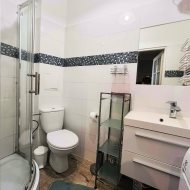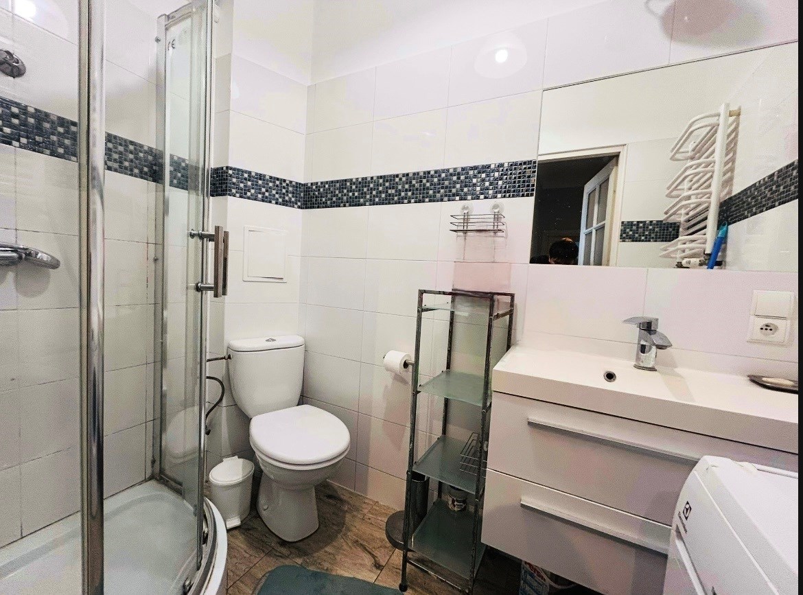 Wyposażenie łazienki | WC, kabina prysznicowa, umywalka na szafce, umywalka, lustro, pralka |