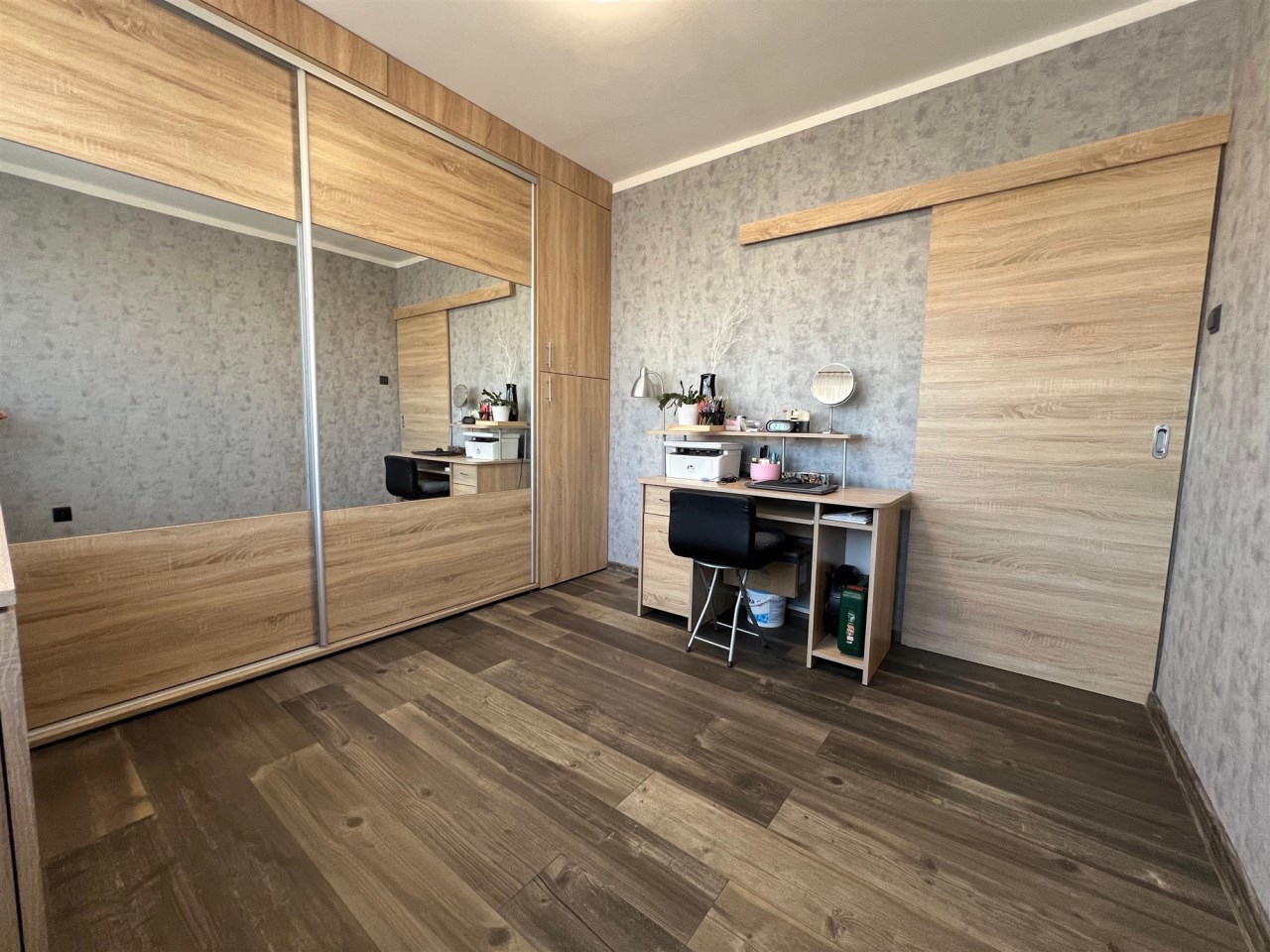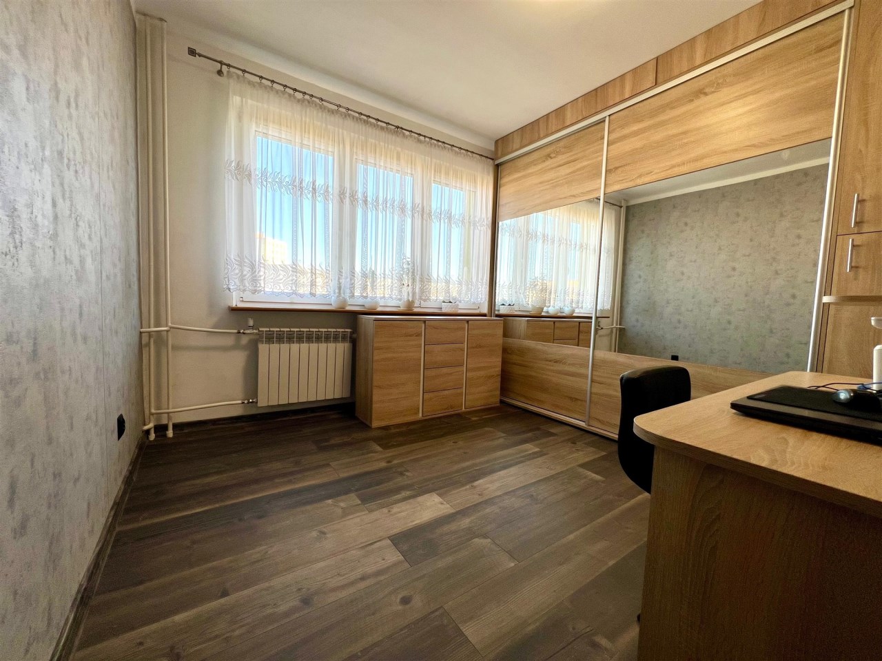 * dodatkowego pokoju, który obecnie pełni funkcję garderoby z dużą zabudową szaf (z powodzeniem może służyć jako pokój dziecięcy lub gabinet)