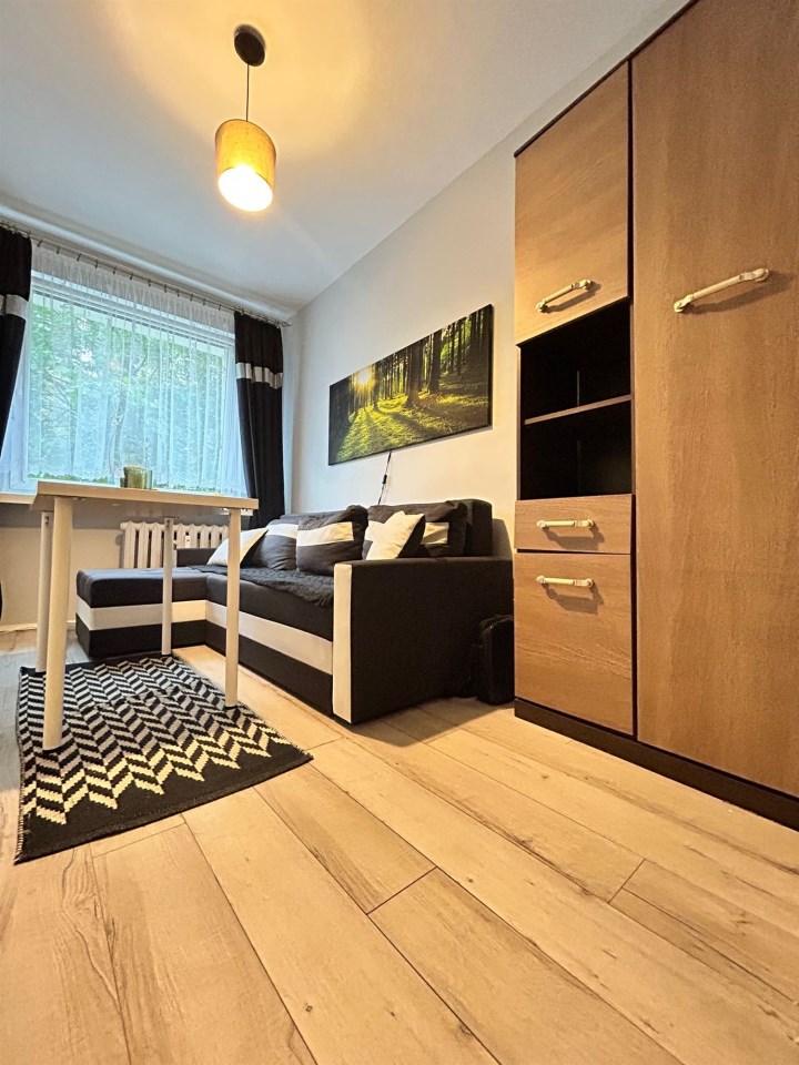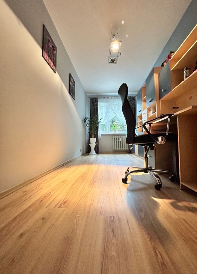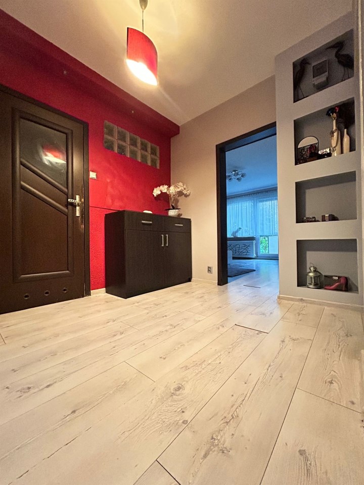 Mieszkanie składa się z salonu z dużymi oknami i wyjściem na balkon, dwóch sypialni, przestronnej kuchni z jadalnią, łazienki z WC oraz przedpokoju z szafą w zabudowie. Układ pomieszczeń jest funkcjonalny i wygodny, a wnętrze zadbane.
