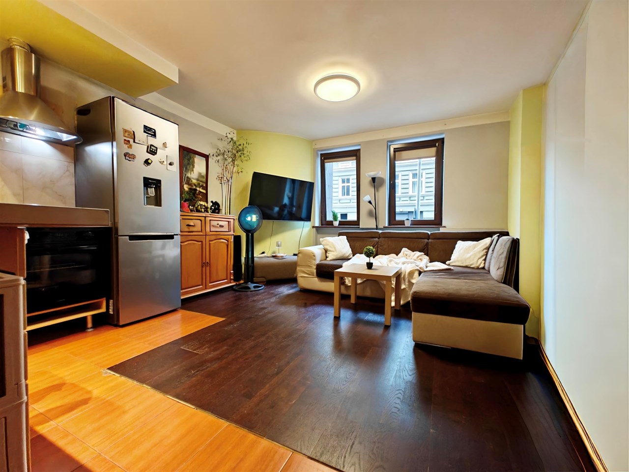 Lokal jest dwustronny (wschód–zachód) i został podzielony na dwa niezależne mieszkania: 2-pokojowe (ok. 40 m²) oraz studio (ok. 20 m²). Istnieje możliwość powrotu do układu pierwotnego lub wykonania osobnego wejścia – idealne rozwiązanie dla kancelarii, biura lub gabinetu.