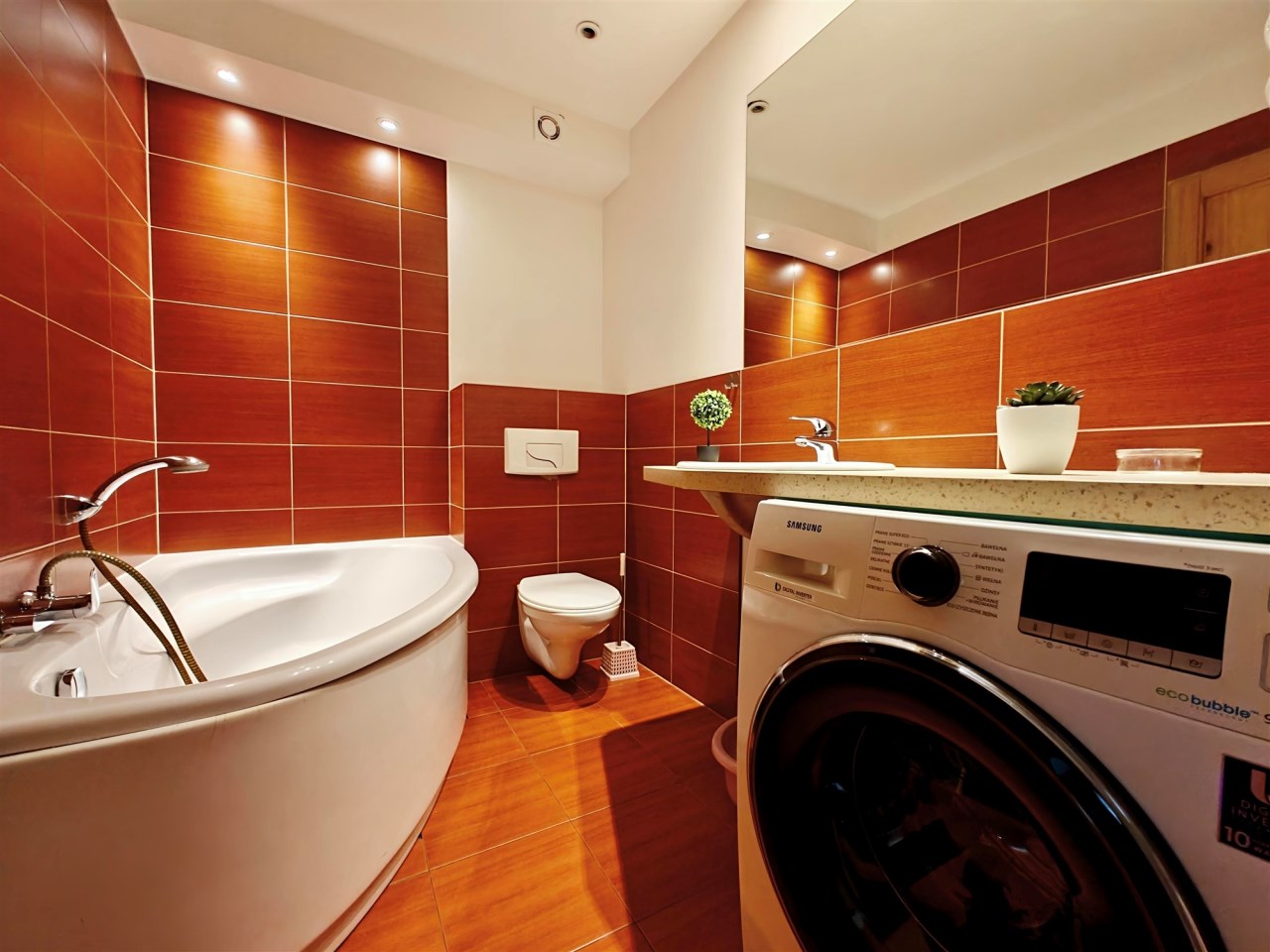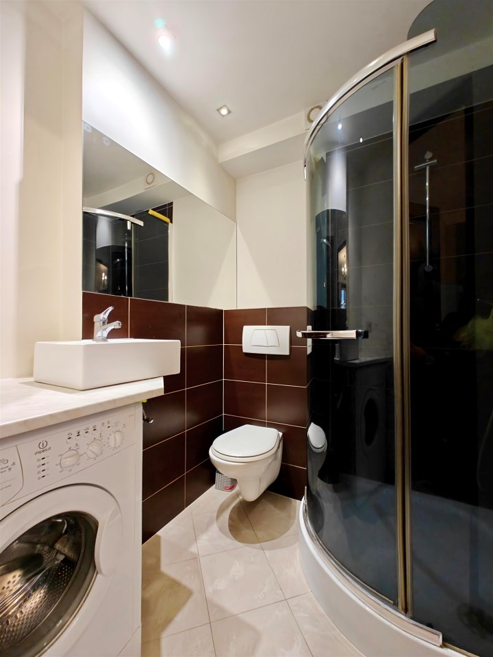 Wyposażenie łazienki | kabina prysznicowa, lustro, pralka, umywalka, WC |