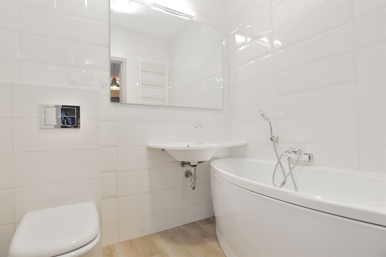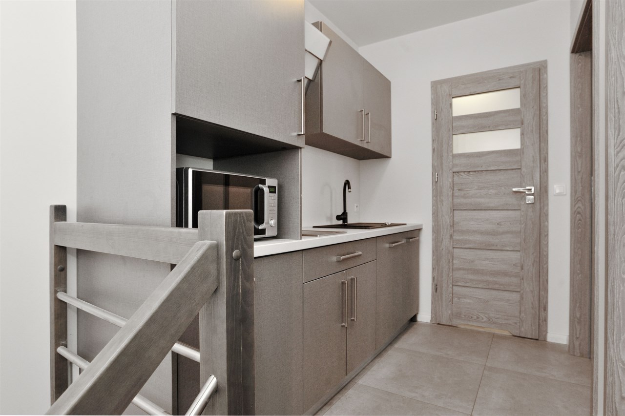 Na I poziomie, hol, pokój dzienny z aneksem kuchennym, sypialnia oraz łazienka z wanną.
