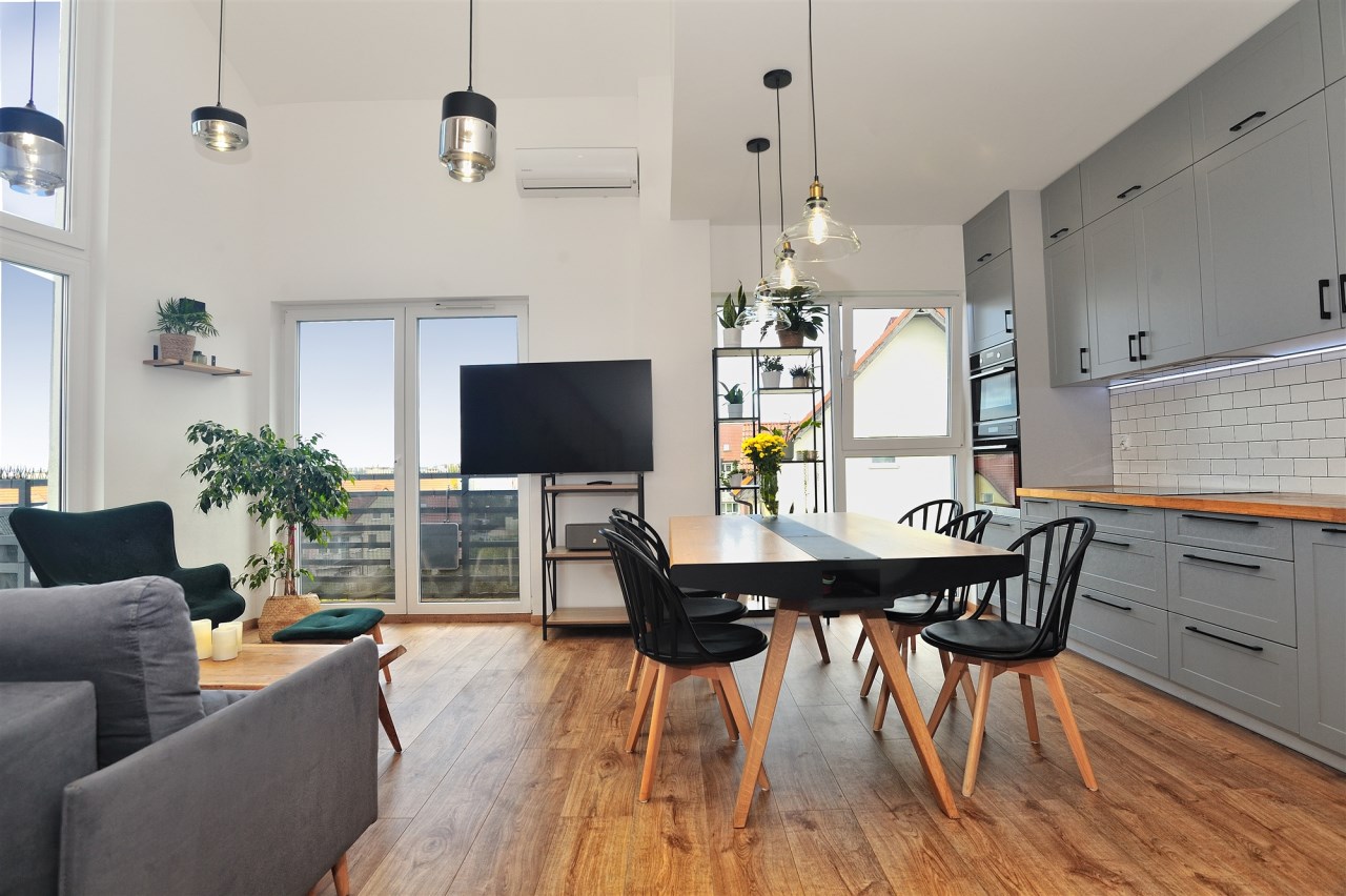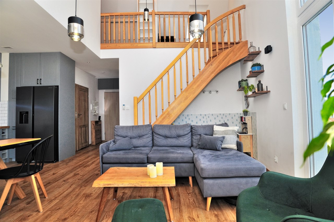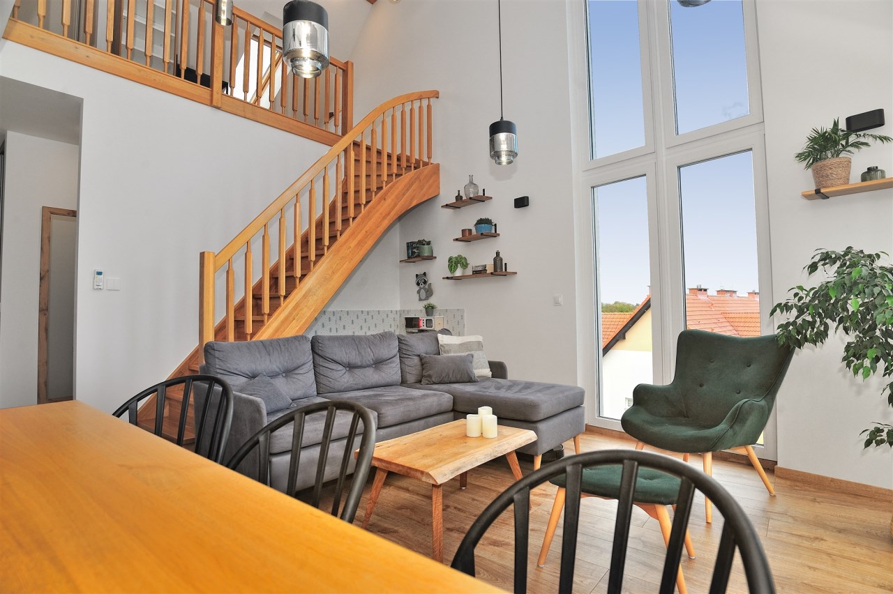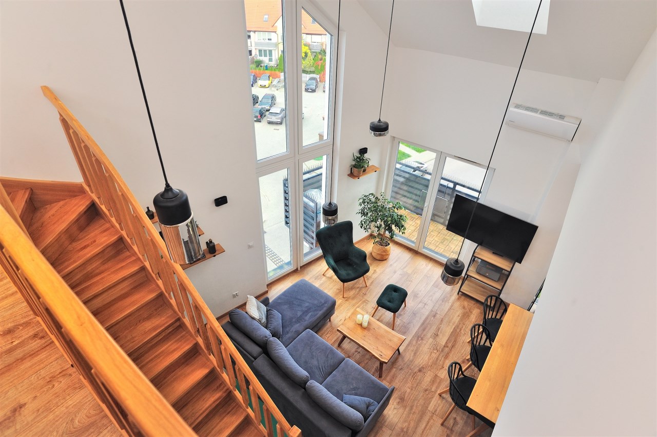 Nietuzinkowe wnętrze z otwartą przestrzenią nad salonem (w najwyższym miejscu 5,5m), wykończone w wysokim standardzie.