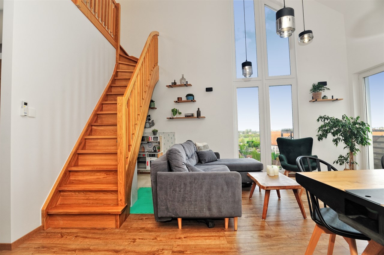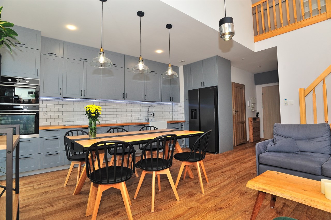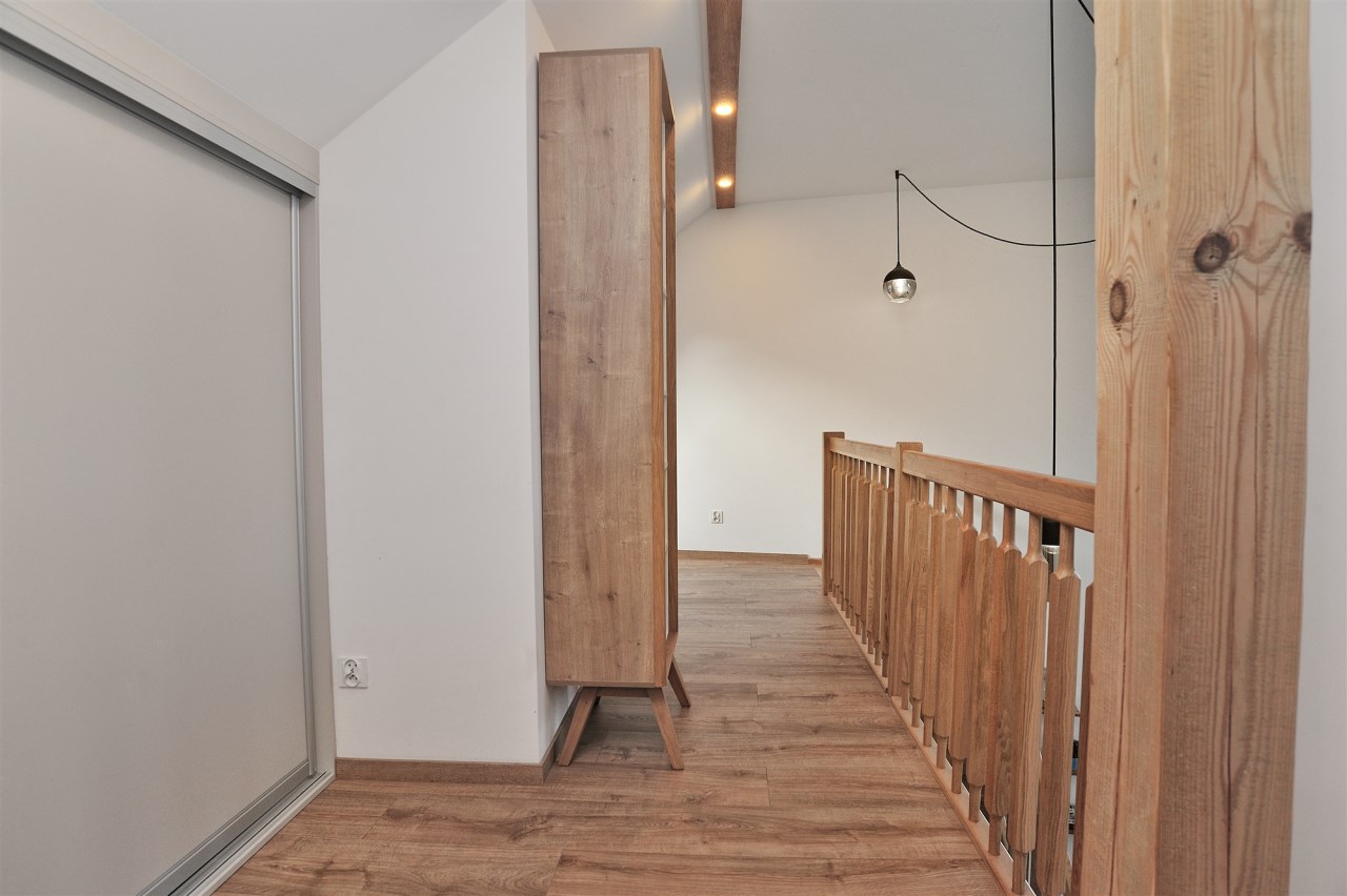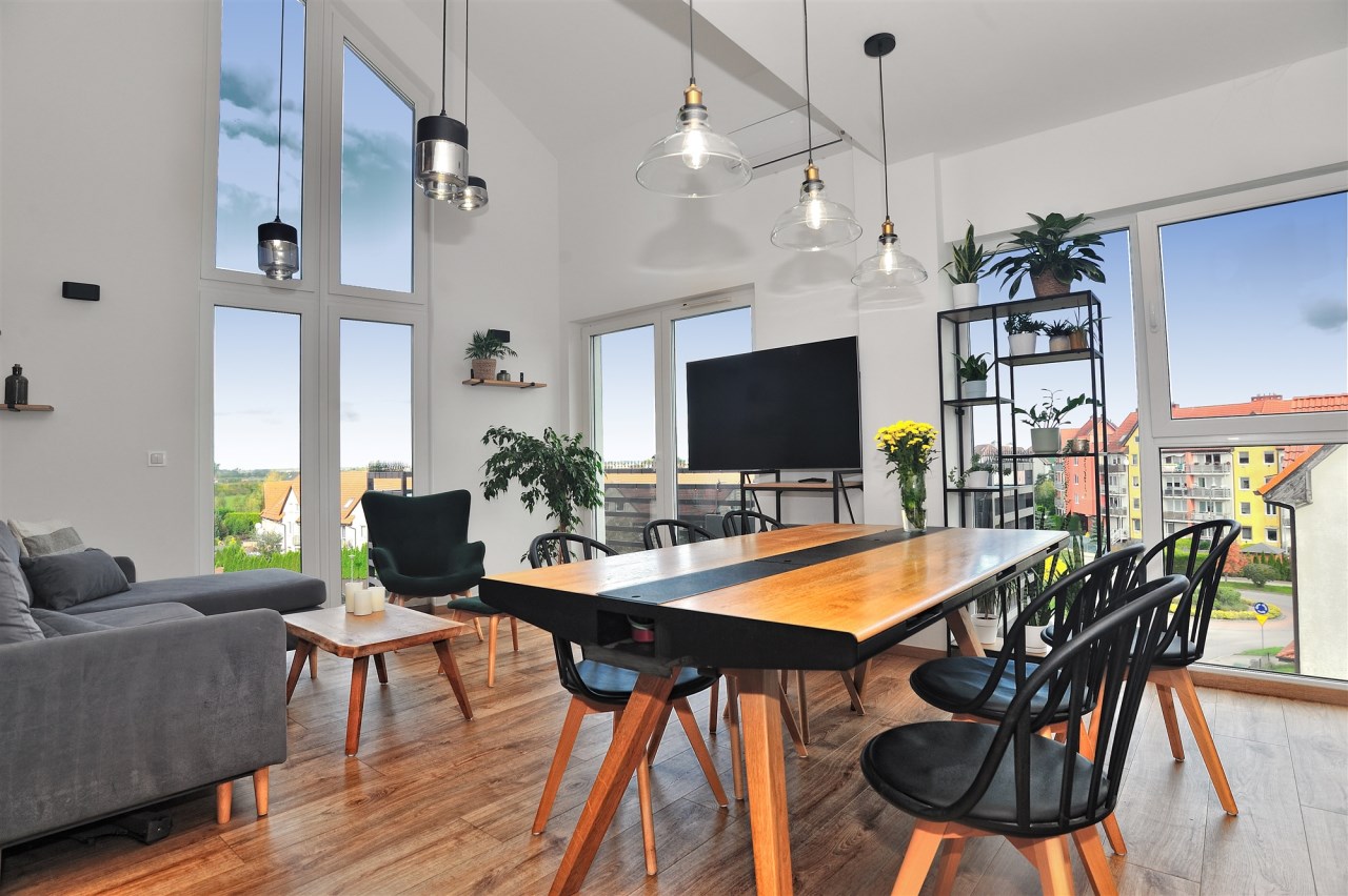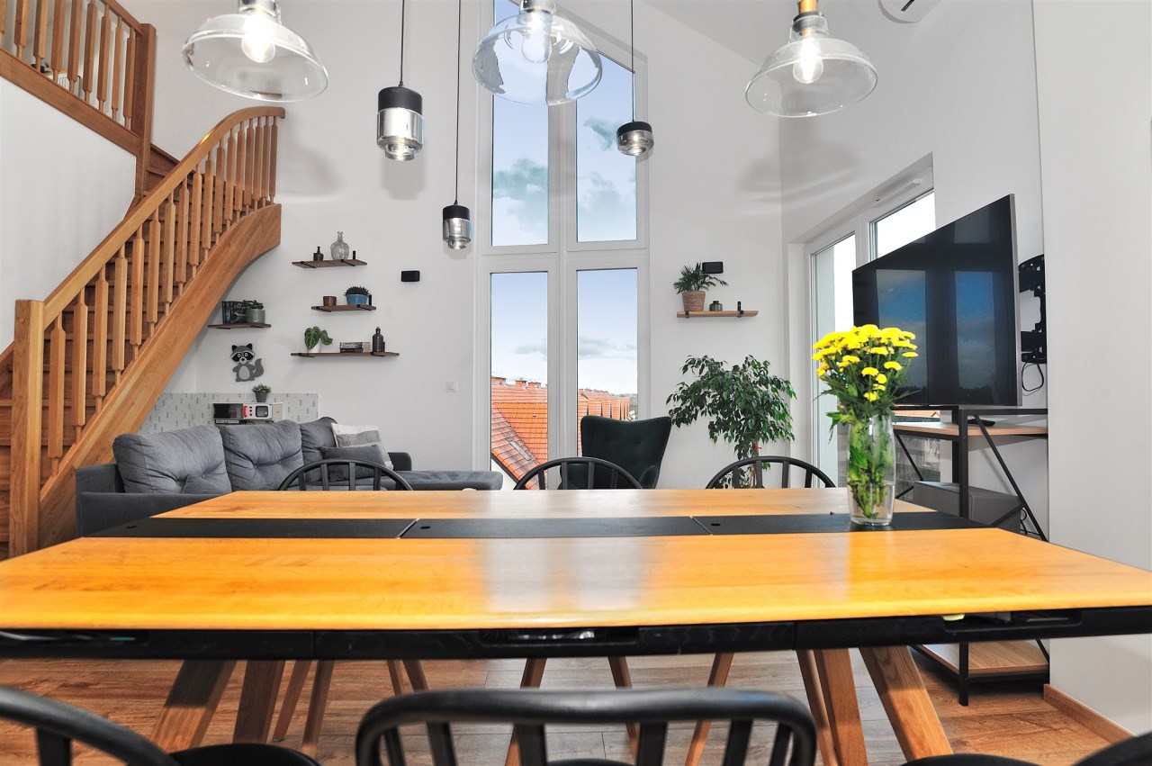 Nietuzinkowe wnętrze z otwartą przestrzenią nad salonem (w najwyższym miejscu 5,5m), wykończone w wysokim standardzie.