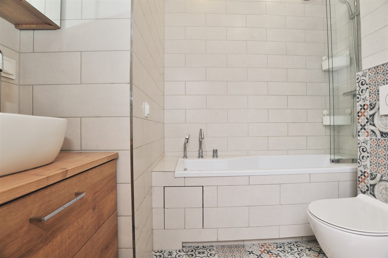 Łazienka o powierzchni 4m2 wyposażona w wannę z dodatkowym prysznicem i deszczownicą.