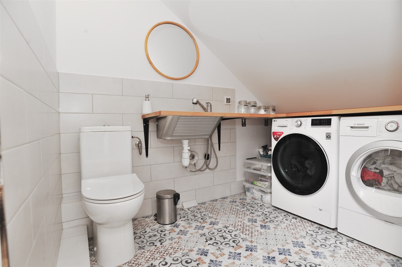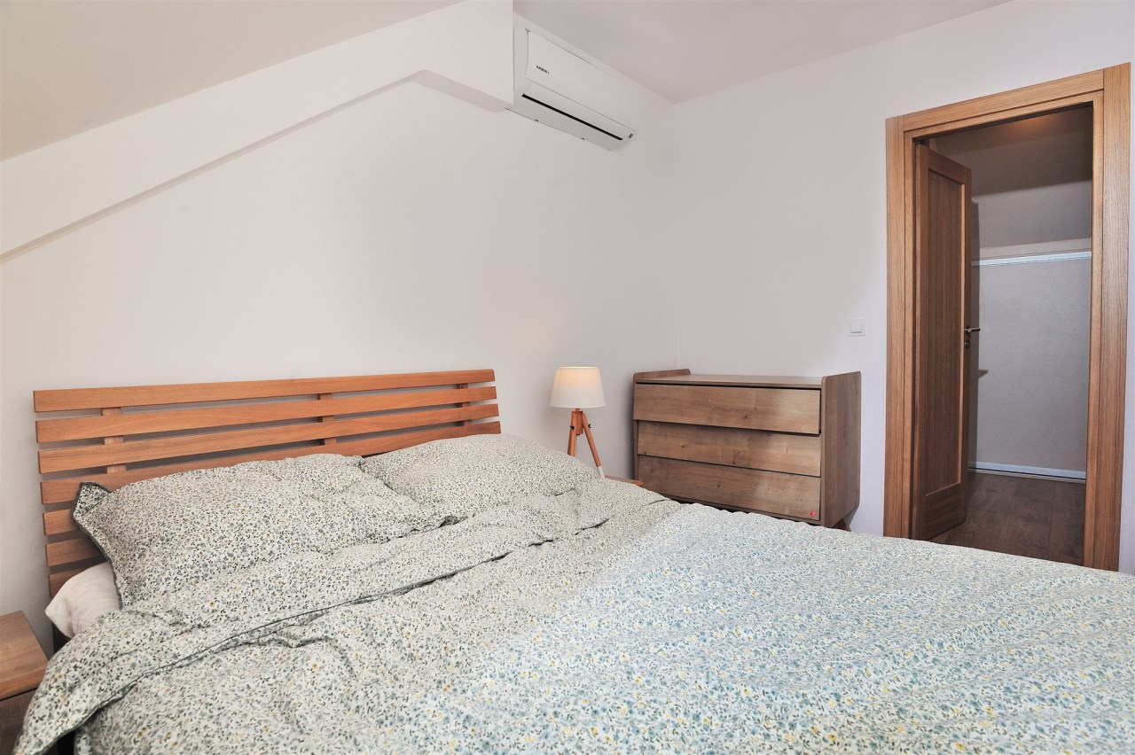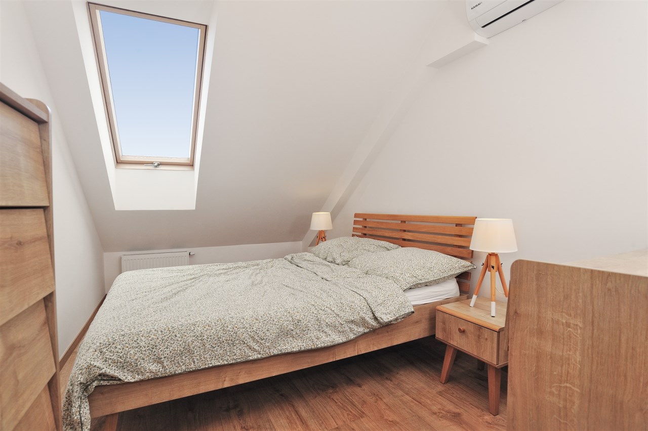 Na górę o powierzchni 20,44 m2 (36,68 m2 powierzchni całkowitej) składa się umeblowana sypialnia, pralnia wyposażona w pralkę i suszarkę, dwie szafy w zabudowie (jedna duża z dodatkową przestrzenią do przechowywania z tyłu), oraz pozostała przestrzeń do zagospodarowania np. na domowe biuro z której jest wyjście na taras o powierzchni 9,77m2.
