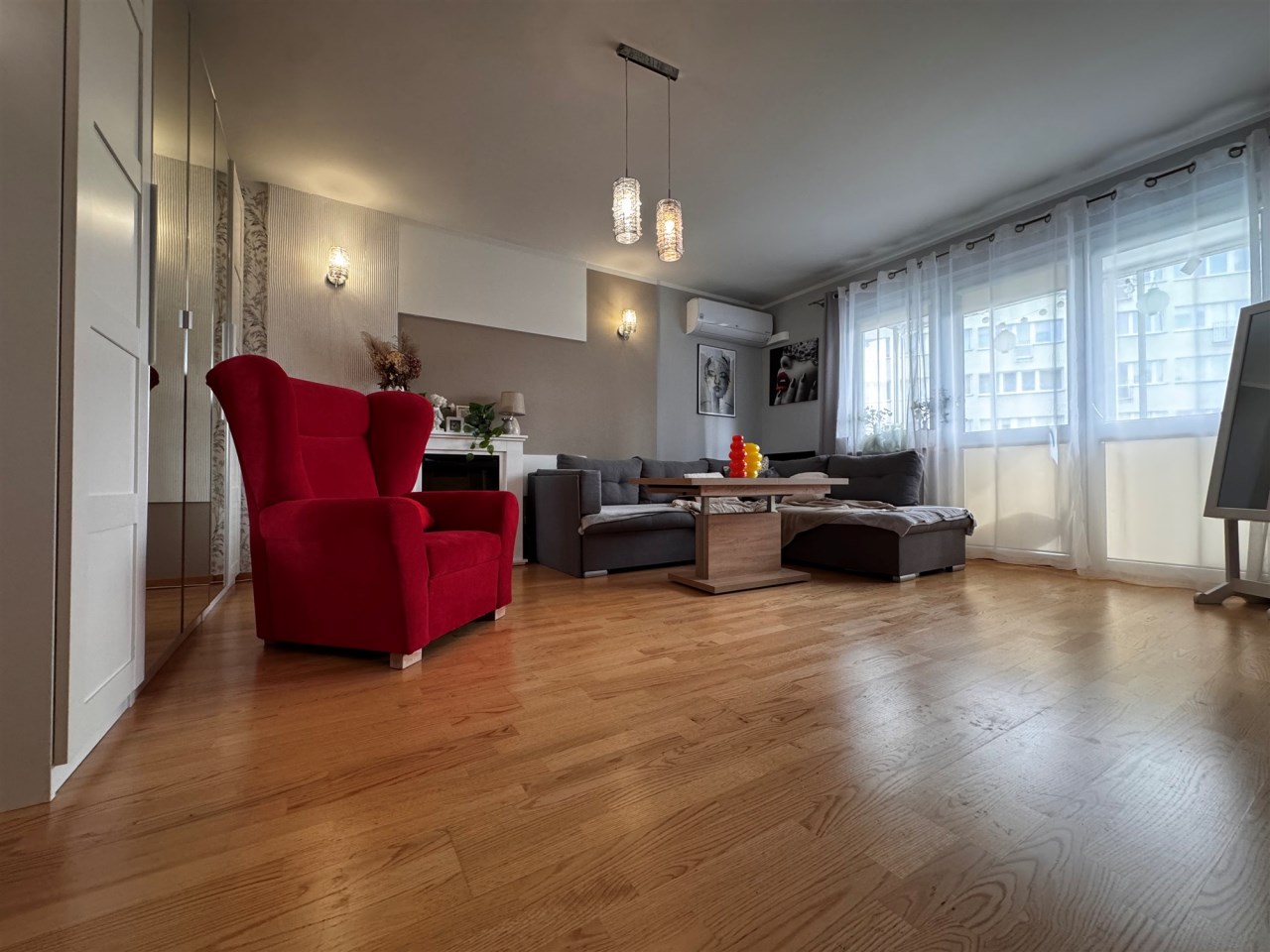 salon z wyjściem na bardzo duży, zabudowany balkon – idealne miejsce na relaks,