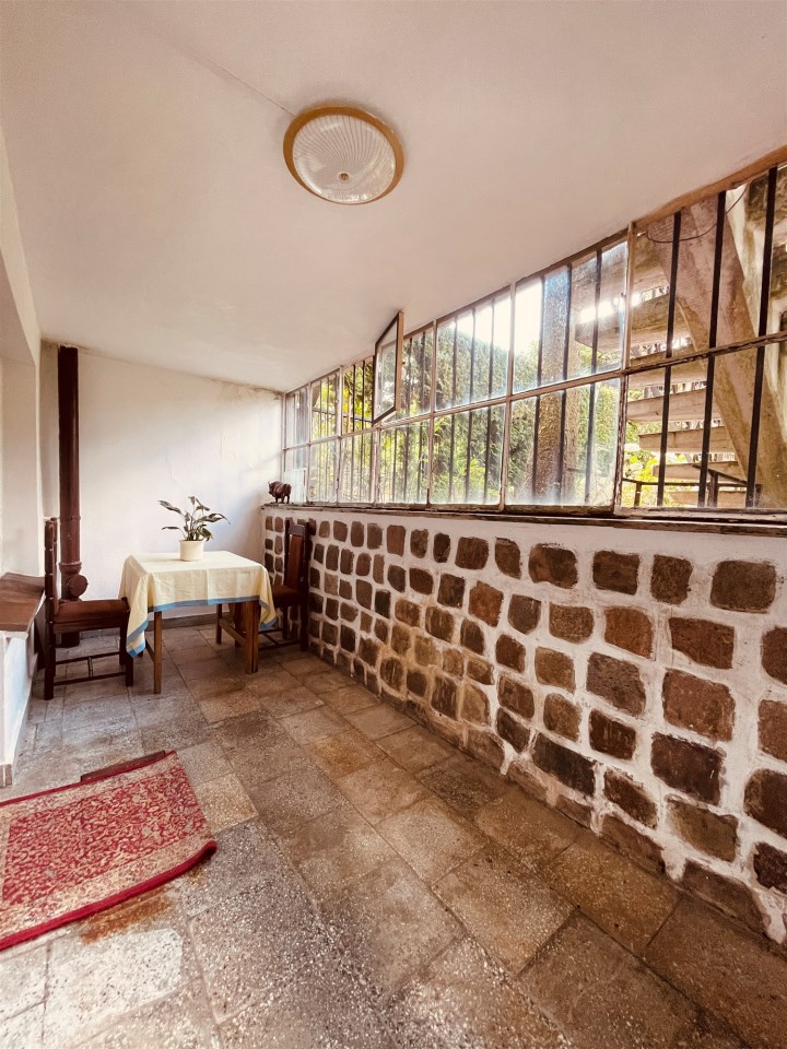 Pokój umeblowany z wyjściem na zabudowaną werandę z wyjściem do ogrodu.