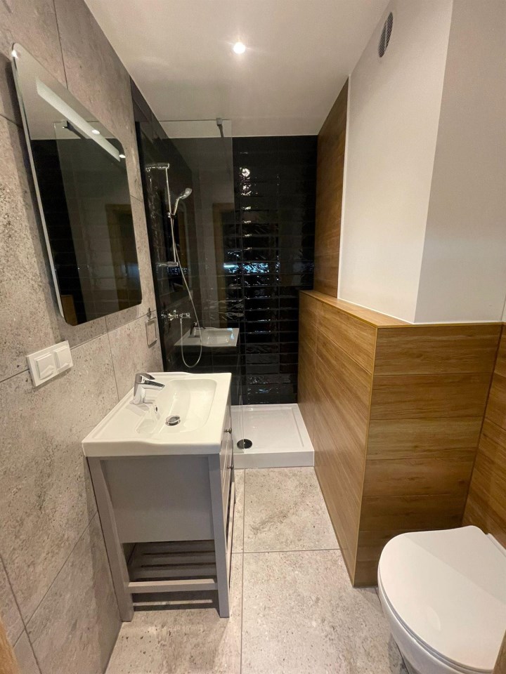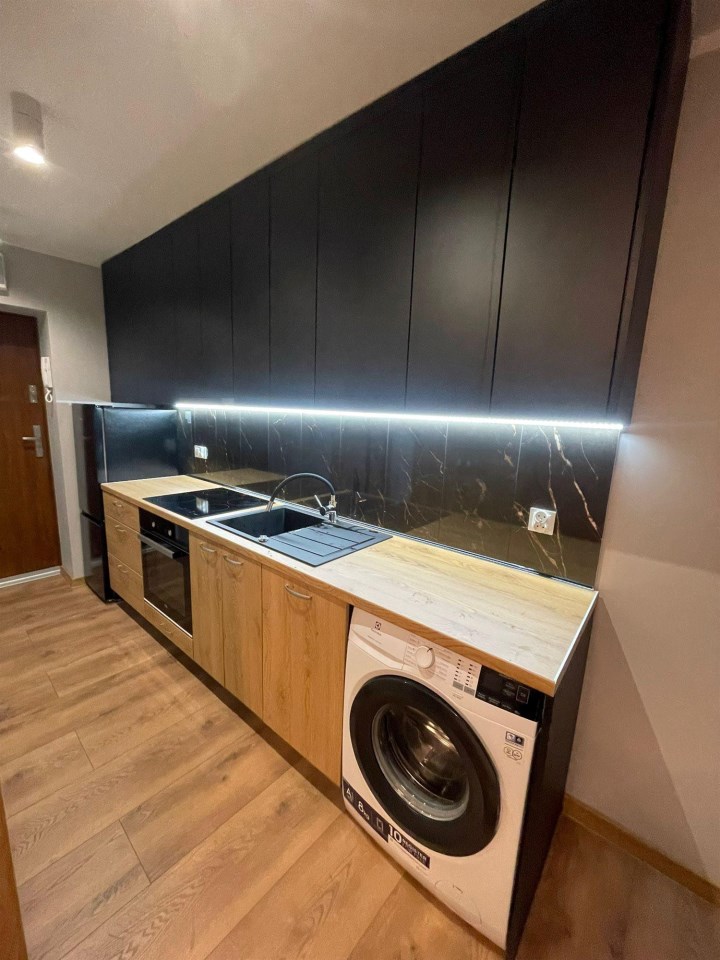 Jest duża szafa, szafka rtv, kanapa rozkładana z miejscem na pościel, kuchnia w zabudowie (płyta indukcyjna, piekarnik, zmywarka, pralka), w łazience dodatkowa szafka.