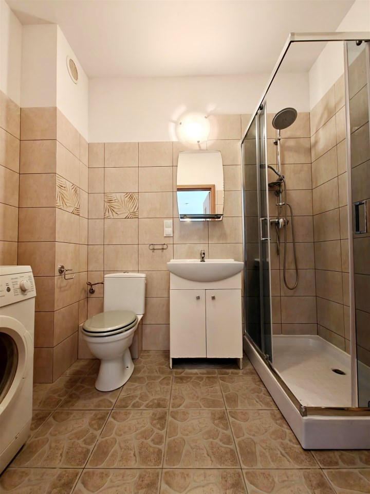 | Wyposażenie łazienki | kabina prysznicowa, lustro, pralka, umywalka na szafce, WC |